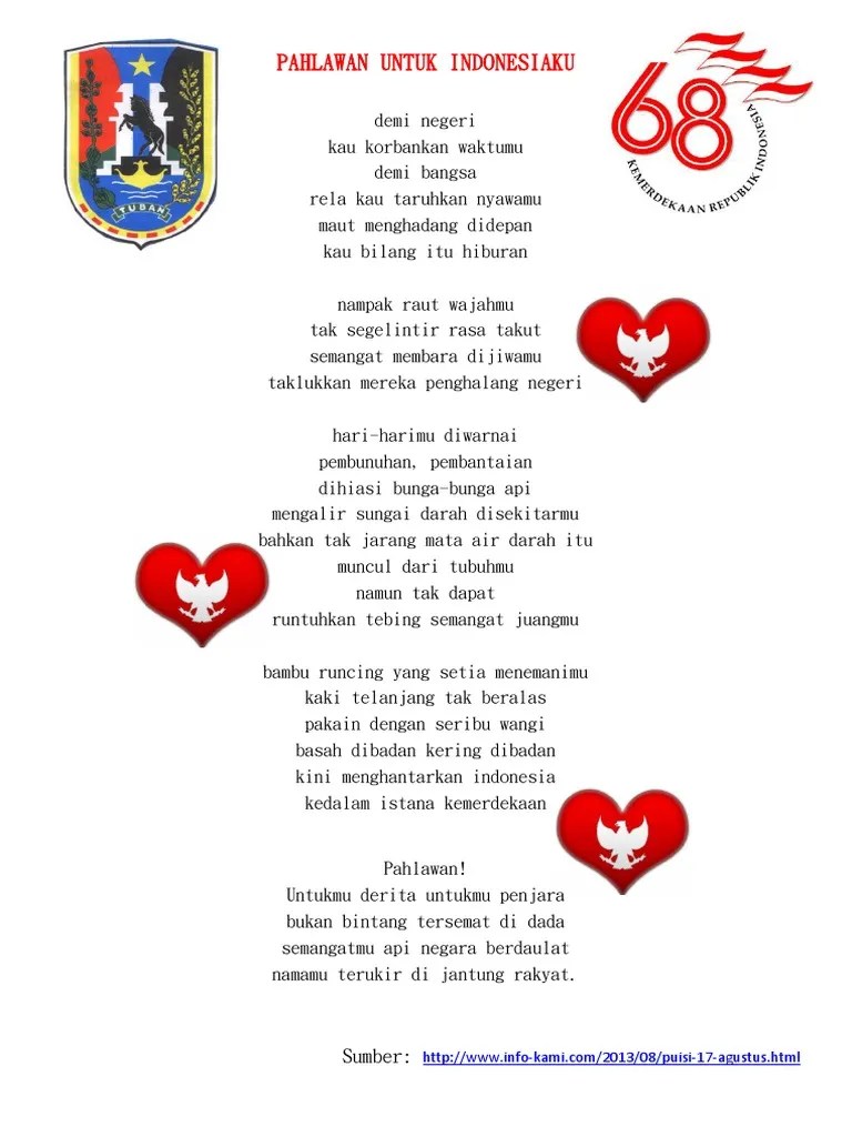 Membaca puisi saat 17 agustus sudah menjadi tradisi untuk . Penting bagi semua masyarakat indonesia karena hal yang menyangkut kemerdekaan. Talibun adalah sebuah pantun yang lebih dari empat baris dan mempunyai sajak abc . Kumpulan puisi dalam bahasa inggris. Selamat menyambut hari kemerdekaan, merdeka merdeka merdeka puisi 4 negeri .